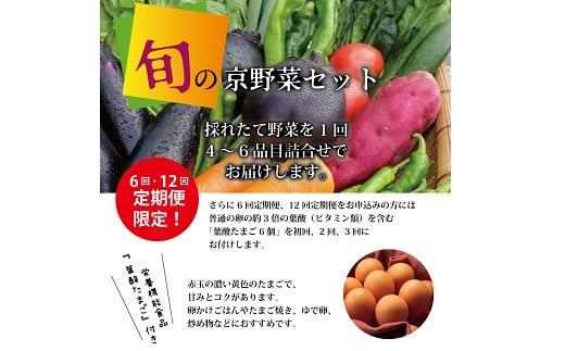 【12回定期便】旬の京野菜 毎月お届けレギュラーコース(全12回)&『葉酸たまご』6個入り×1パック×3回分付 《野菜定期便 野菜詰め合わせ 野菜セット 京野菜 旬の野菜 新鮮野菜 有機野菜 減農薬 卵》 ※沖縄・その他離島は配送不可 [132KH001R]