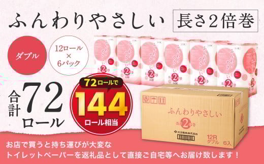 トイレットペーパー ふんわりやさしい 長さ 2倍巻き 50m ダブル 計72個 日本製 防災