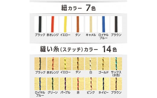 縫い糸(ステッチ):ブラック・赤オレンジ・イエロー・タン・白・ゴールド・サックス(水色)・ロイヤルブルー・グリーン・パープル・赤・ピンク・ネイビー・ブラウン)