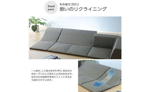1人掛け、2人掛けは背もたれが可動しますのでごろ寝に最適です。セパレート式ですので、自由自在にレイアウト変更できます。用途にあわせてロースタイルをお楽しみください。