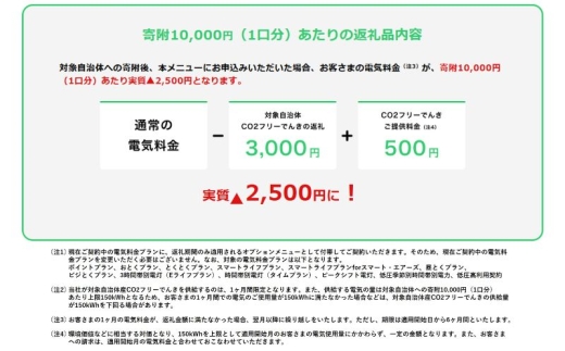 ※2 寄附10,000円(1口分)につき、返礼として3,000円分をお客さまの電気料金の支払いへ充当させていただきますが、ご提供にあたっては、寄附10,000円(1口分)につき500円(非化石証書に基づく料金)を電気料金として申し受けさせていただくため、お客さまの電気料金へ充当される金額は実質2,500円となります。【寄附10,000円(1口分)あたり3,000円-500円】