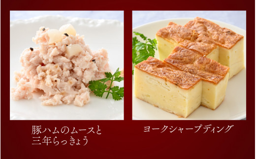 【豚ハムのムースと3年らっきょう】豚肉(スペイン産)、牛乳、ブイヨン(玉葱、にんじん、セロリ、パセリ、白ワイン、果実酢、食塩、胡椒)、らっきょう(福井県産)(砂糖、醸造酢、食塩)/ 調味料(有機酸等)、リン酸塩(Na)、酸化防止剤(ビタミンC)、発色剤(亜硝酸Na)