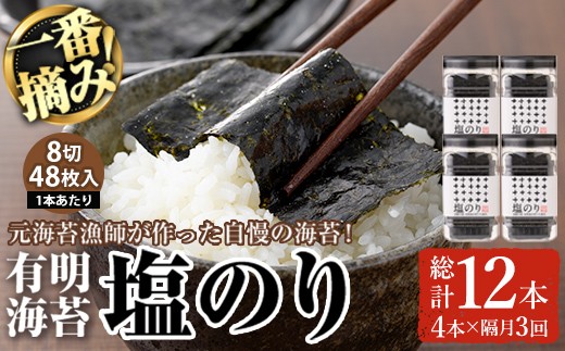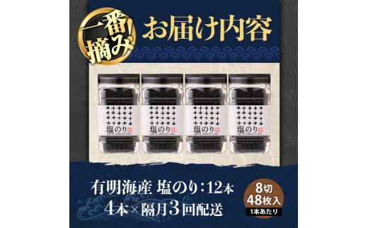 <隔月3回定期>有明海産・一番摘み海苔 塩のり(総計12本・8切48枚×4本×3回) 福岡県産有明のり 海苔 味海苔 有明海 初摘み 一番摘み 常温 常温保存 定期便【ksg1831】【COLEZO】