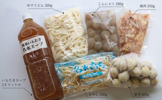(里芋:400g、鶏肉:250g、こんにゃく:280g、もやし:200g、ゆでうどん:300g、いもたきスープ:1.5L)