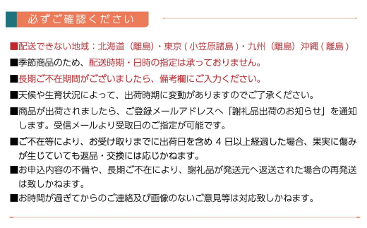 ※ご不在等により、お受け取りまでに出荷日を含め4日以上経過した場合、果実に傷みが生じていても返品・交換には応じかねます。