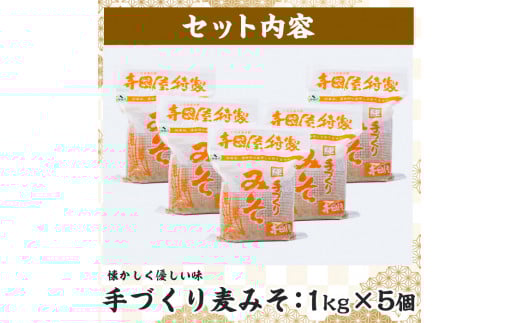 寺田屋 手づくり麦みそ 5kg(1kg×5個) 子どもにも評判の優しい味付けの麦味噌♪冷蔵 麦みそ【A-1689H】