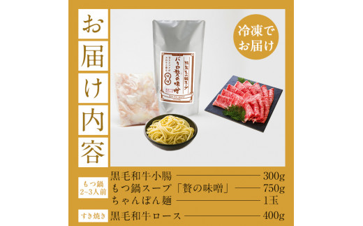 鹿児島県産 黒毛和牛 「ロース すき焼き用 400g×1P」 と 「もつ鍋 <味噌味> 2~3人前(小腸 300g 「贅の味噌」スープ、〆のちゃんぽん麺付き!)」冷凍 鹿児島県産 黒毛和牛 の 小腸 を使用した もつ鍋 を お取り寄せ 九州 の もつ鍋セット【C-105H】