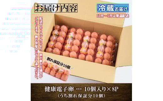 健康電子卵 赤卵 Lサイズ 80個(10個×8パック)(うち、割れ保証分10個)国産 鹿児島県産 鶏卵 1パック10個入りで使い勝手がいい!【A-1052H】