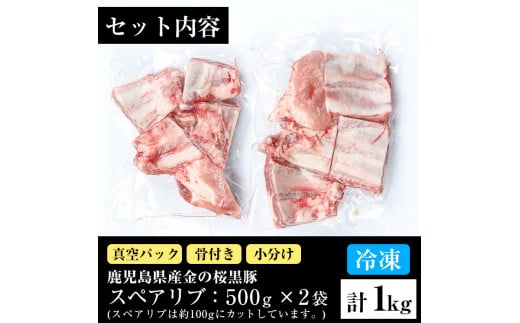 金の桜黒豚 骨付き スペアリブ 約1kg(500g×2袋)真空パックでお届け!冷凍 小分け 真空包装 国産 鹿児島県産 黒豚 骨付き スペアリブ バーベキュー グリル にもおすすめ【A-1385H】
