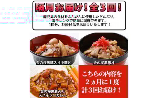 【3回定期便/隔月】レンジでチン!金の桜黒豚 3種 おかず 詰め合わせ 6食入り 計18食「中華丼の具(220g×2袋)」「黒豚丼(180g×2袋)」「スパイシーカレー(200g×2袋)」を3回お届け! 冷凍 小分け の おかず セット レンジ 簡単調理 レトルト 電子レンジ対応 温めるだけ で お手軽 時短!【C-177H】