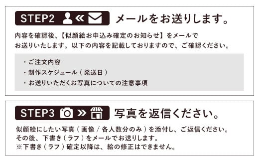 ③似顔絵にしたい写真(画像)を添付し、ご返信ください。その後、下書き(ラフ)をメールでお送りします。※下書き(ラフ)確定以降は、絵の修正はできません。