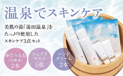 美肌の湯たっぷりの温泉コスメ「ゆだうるる」をセットにしました。無香料無添加のお肌に優しいハンドクリームもセットにしました。おうち美容のお供に!