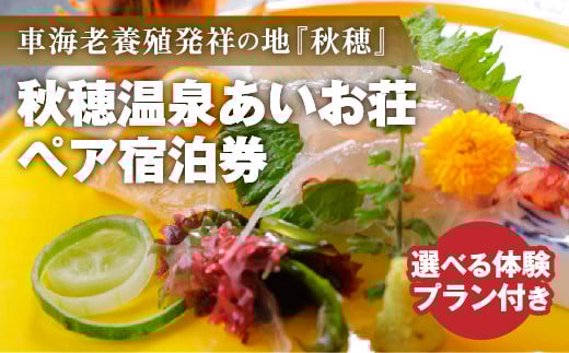 「車海老養殖発祥の地 秋穂」にある瀬戸内海に臨む秋穂温泉あいお荘で、車エビをご賞味いただけます。また、選べる体験プランからマリンアクティビティ他みかん狩り等お楽しみいただけます。