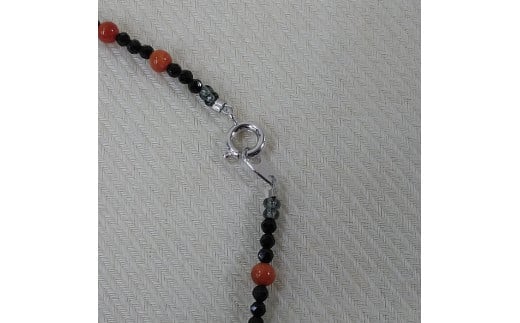 アフリカ珊瑚(約3㎜の珠)・ブラックスピネル(約2㎜のマシンカット)製ネックレス1本 長さ約40㎝(真鍮製引き輪・プレートを含む)