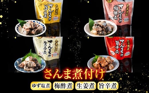 【内容量】さんま煮付(旨煮・味噌煮・黒酢煮)95g(固形量70g)×各8P、さんま煮付(ゆず塩煮・梅酢煮・生姜煮・旨辛煮)95g(固形量70g)×各6P