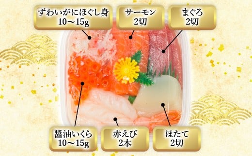 【主要原材料】まぐろ、サーモン、いくら、赤えび、ほたて、ズワイガニほぐし身