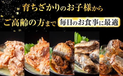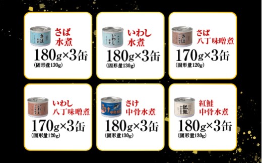 【内容量】さば水煮180g(固形量130g)×3缶、いわし水煮180g(固形量130g)×3缶、さば八丁味噌煮170g(固形量120g)×3缶、いわし八丁味噌煮170g(固形量120g)×3缶、さけ中骨水煮180g(固形量130g)×3缶、紅鮭中骨水煮180g(固形量130g)×3缶