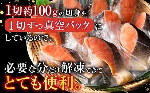 天然の沖獲れ鮭を塩で味付けして熟成させました。1切100gの切身を1切れずつ真空パック詰めしておりますので、使いやすいです。