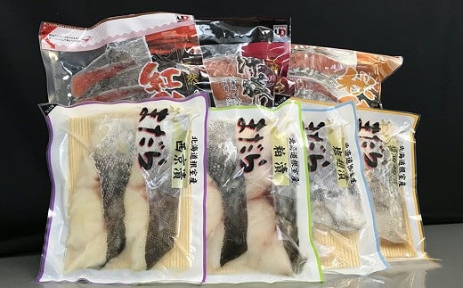 【内容量】紅鮭切身5切×1P、時鮭切身5切×1P、秋鮭切身5切×1P、真鱈塩麹漬2切×1P、真鱈?油麹漬2切×1P、真鱈西京漬2切×1P、真鱈粕漬け2切×1P
