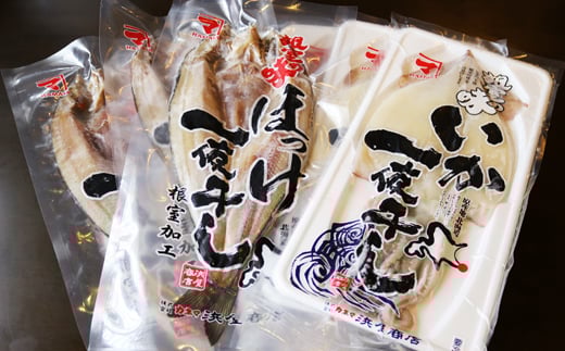 北海道で水揚げされた新鮮で脂乗りの良い真ほっけと真いかを選別し、塩のみを使用した無添加仕立ての一夜干しです。
