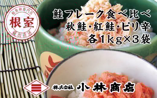 【内容量】秋鮭フレーク・紅鮭フレーク・ピリ辛フレーク各1kg(計3kg)
