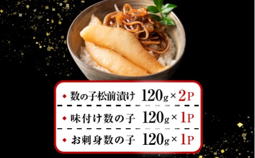 【内容量】数の子松前漬け120g×2P、味付数の子120g×1P、お刺身数の子120g×1P