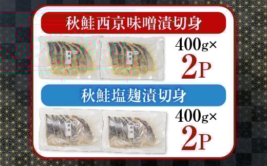 【内容量】秋鮭西京味噌漬切身400g×2P、秋鮭塩麹漬切身400g×2P