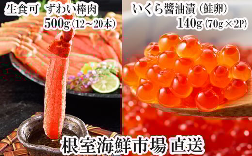 B-11103【12/10まで年内配送】 お刺身OK!生ずわいがに棒肉ポーション12~20本(計500g)、いくら醤油漬け(鮭卵)70g×2P(計140g)