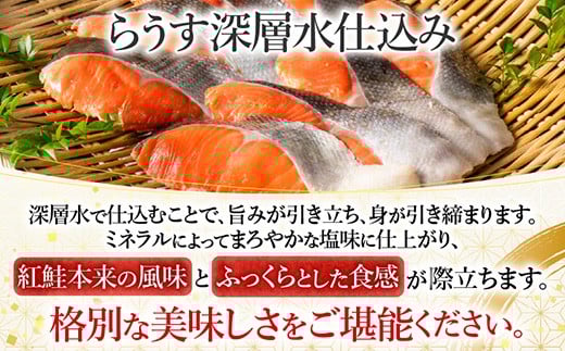 沖獲りした紅鮭を甘塩に仕立て1切れ真空にしました。らうす深層水仕込みのためミネラルが豊富となっています。※焼きすぎにはご注意ください。