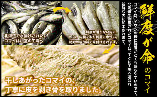北海道の珍味、干しこまいを皮も骨も取り除き身だけにしてありますのでとても食べやすいです。そのままはもちろん、マヨネーズをつけても美味しいです。