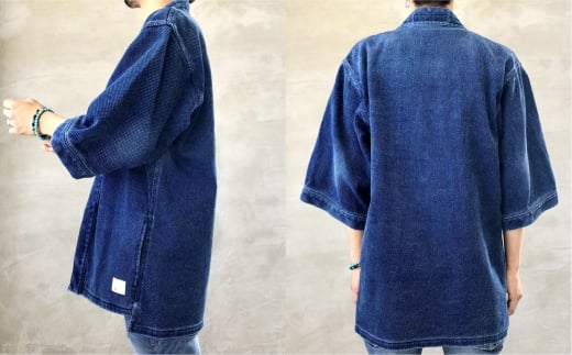 日本伝統の刺し子生地を贅沢に使用。豊かな凹凸感と風合いが魅力の一着は、和の奥深さをまとう特別な一枚。