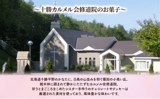 北海道十勝平野のかなたに、日高の山並みを仰ぐ幕別の小高い丘。雑木林に囲まれて静かにたたずむカルメル会修道院。祈りとまごころをこめたシスター手作りのチョコレートとクッキーは厳選された素材を使っており、風味豊かな味わいです。