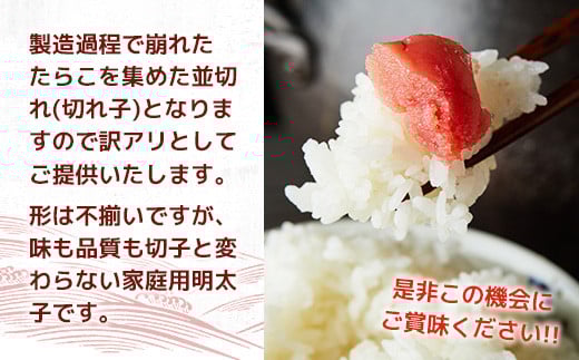 形は不揃いですが、味も品質も切子と変わらない家庭用明太子です。是非この機会にご賞味ください。