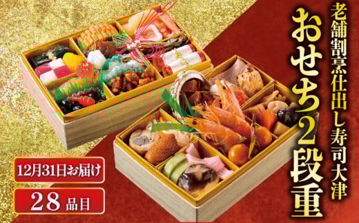 【数量限定・12月31日お届け】 下関 老舗割烹仕出し・寿司大津のおせち2段重 2人前 28品 冷蔵 ( 正月 おせち料理 年末 年始 年内配送 迎春 人気 寿司屋 おせち料理2026 生おせち カニ風味蒲鉾 数の子 カツオ 地鶏 イカ 烏賊 魚介 エビ えび 海老 焼き豚 鱈 鰹 かつお かに 蟹 冬 )