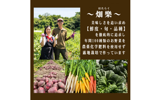 人参・(色)大根・玉ねぎ・じゃがいも・サツマイモ・かぶ・キャベツ・かぼちゃ・里芋・ビーツ・ごぼう・にんにく・ほうれん草・ネギ・ベビーリーフ・レタス・ルッコラ・ケール・ブロッコリー・カリフローレ・コリンキー・セロリ・からし菜・水菜・わさび菜・つぼみ菜・ホーリーバジル・アスパラ・フェンネル・冬瓜・唐辛子・ハーブ