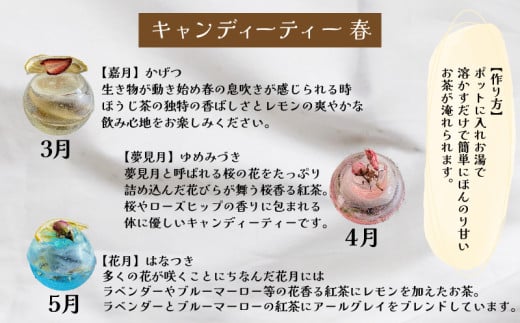 『春』は12か月のキャンディーティーの内、3月のお茶【嘉月】、4月のお茶【夢見月】、5月のお茶【花月】の3種類のキャンディーティーと