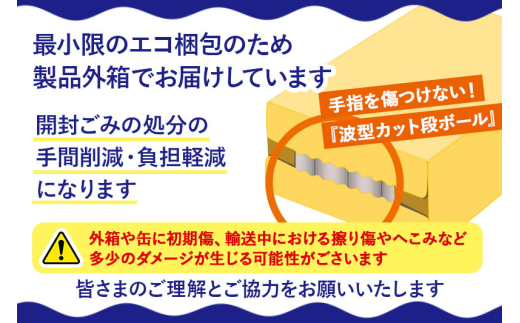 ※まれに、輸送中の揺れや衝撃により外箱の汚損・破れ・ゆがみが発生し、缶に傷や凹みが出ることがあります。返礼品は正規品であり、異常はございませんので、安心してお飲み頂けますが、亀裂による液漏れなどがあった場合は、返礼品到着から7日以内にご連絡ください。