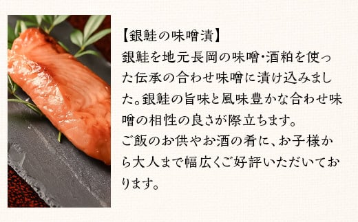 銀鮭を地元長岡の味噌・酒粕を使った伝承の合わせ味噌に漬け込みました。銀鮭の旨味と風味豊かな合わせ味噌の相性の良さが際立ちます。