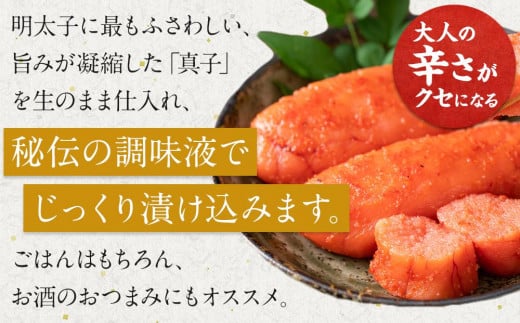原材料:すけそうだらの卵巣(ロシアまたはアメリカ)、米発酵調味液、食塩、たん白加水分解質、唐辛子、香辛料、ぶどう糖、そうだかつおぶし粉末、調味料(アミノ酸、核酸、有機酸)、甘味料(ソルビトール)、酸化防止剤(ビタミンC)、発色剤(亜硝酸Na)、酵素