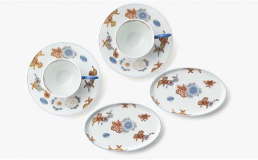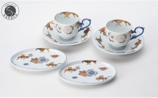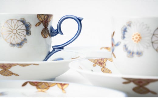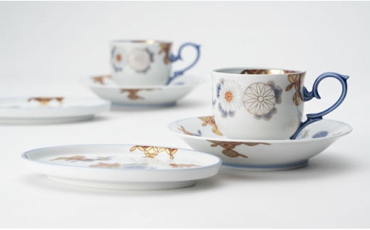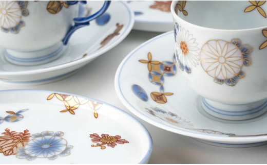 格式高い菊に縁起の良い七宝を描いた碗皿と小皿のセット