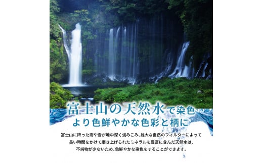 富士山に降った雨や雪が地中深く浸みこみ、雄大な自然のフィルターによって長い時間をかけて磨き上げられたミネラルを豊富に含んだ天然水は、不純物が少ないため、色鮮やかな染色をすることができます。