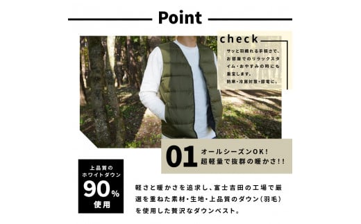 ~MADE IN JAPAN~にこだわり軽さと暖かさを追求し富士吉田市の工場で厳選を重ねた素材・生地・上品質のダウン(羽毛)を使用し、より贅沢なダウンベストを造り上げております。