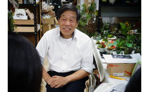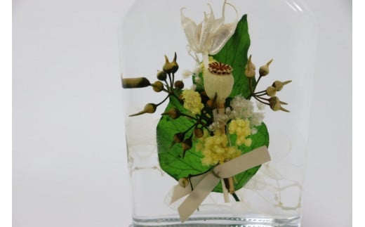 ウイスキーボトル型の瓶に、加工を施した花材でミニブーケをデザインしました。