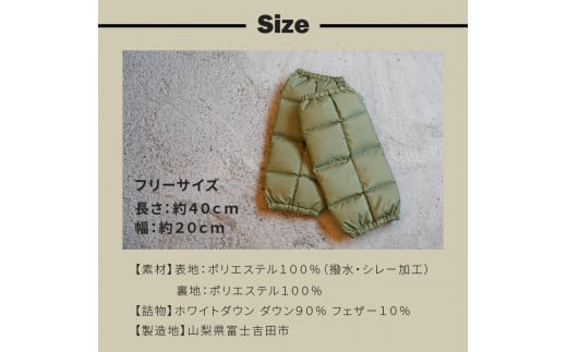 ~MADE IN JAPAN~にこだわり、軽さと暖かさを追求し、富士吉田市の工場で厳選を重ねた素材・生地・上品質のダウン(羽毛)を使用し、より贅沢な羽毛レッグウォーマーを造り上げております。