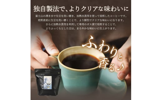 富士山の湧き水で生豆を洗い磨き、加熱水蒸気を使って焙煎したコーヒーです。