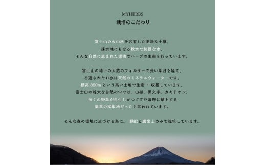 富士吉田市のミネラル豊富な水で育ったハーブを中心とし、それ以外の茶葉も国内提携農家の物を使用していますので安心してお召し上がりいただけるハーブティーです。