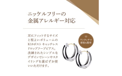 K18ポスト キャッチレスドロップフープピアス 1ペア(2個セット)