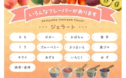 【ジェラート】もも、くり、キウイ、抹茶・金時、ポポー、ブルーベリー、あずき、かぼちゃ、さつまいも、いちじく、紫芋、黒ゴマ、ゆず