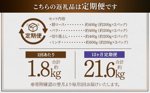 KS-003 【12ヶ月定期便】鹿児島県産黒豚 4種詰合せセット(約1.8kg×12回)