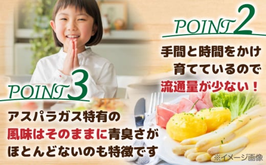 土寄せを行ったり、日光に当てずに栽培しているため、通常のアスパラガス栽培に比べ手間と時間がかかっているため流通量が極端に少ないです。